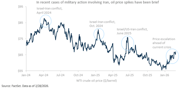 This latest crisis involving Iran has pushed up oil prices and may put short-term pressure on risk assets. History suggests, however, that these episodes are temporary, with oil prices eventually easing back toward more moderate levels. Geopolitical shocks are a recurring feature of markets. Maintaining discipline during periods of uncertainty remains a key driver of long-term investment success.